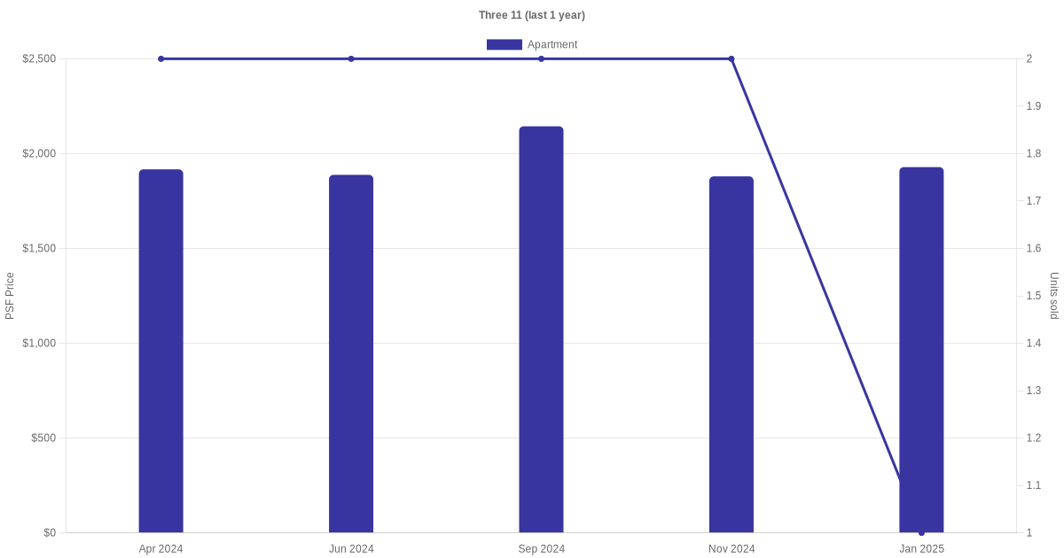 There were a total of 15 sales transactions for Three 11 in the last 3 years, with the latest one recorded in Oct 2025. Disclaimer : our transactions data below does not include block numbers as the data is not available.