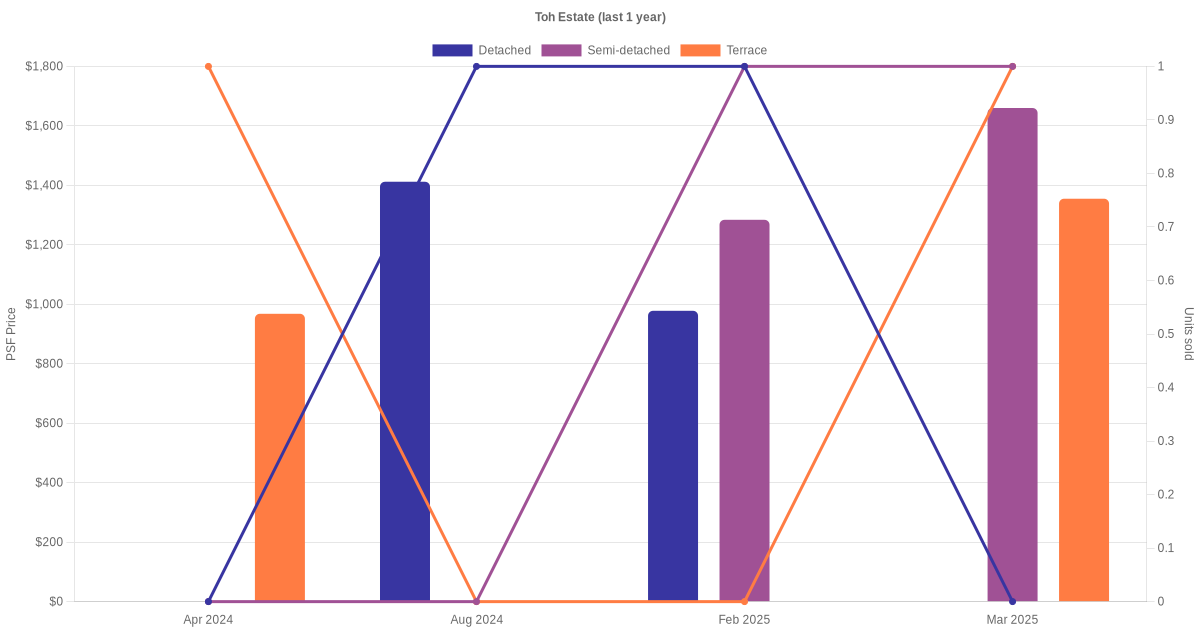 There were a total of 13 sales transactions for Toh Estate in the last 3 years, with the latest one recorded in Jul 2025. Disclaimer : our transactions data below does not include block numbers as the data is not available.