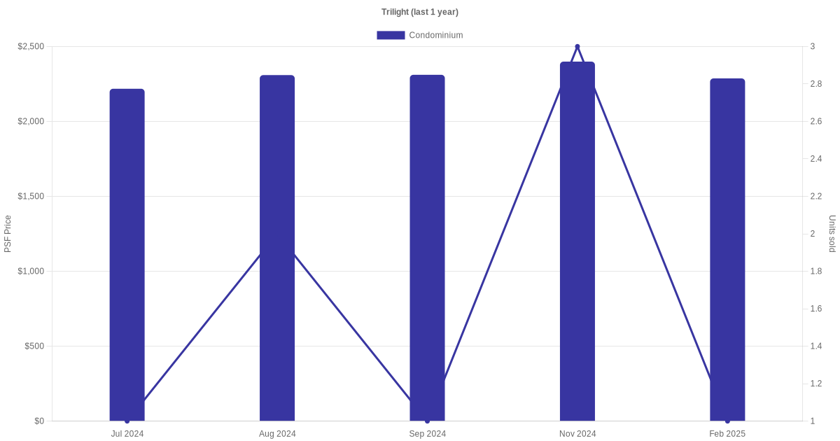 The graph below shows the average monthly transacted sale price for each of the condominium units for Trilight in the last 3 years. This is based on the transactional data collated for Trilight for the selected period.