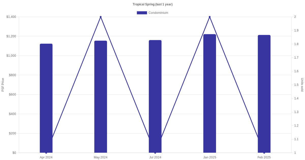 There were a total of 26 sales transactions for Tropical Spring in the last 3 years, with the latest one recorded in Dec 2025. Disclaimer : our transactions data below does not include block numbers as the data is not available.