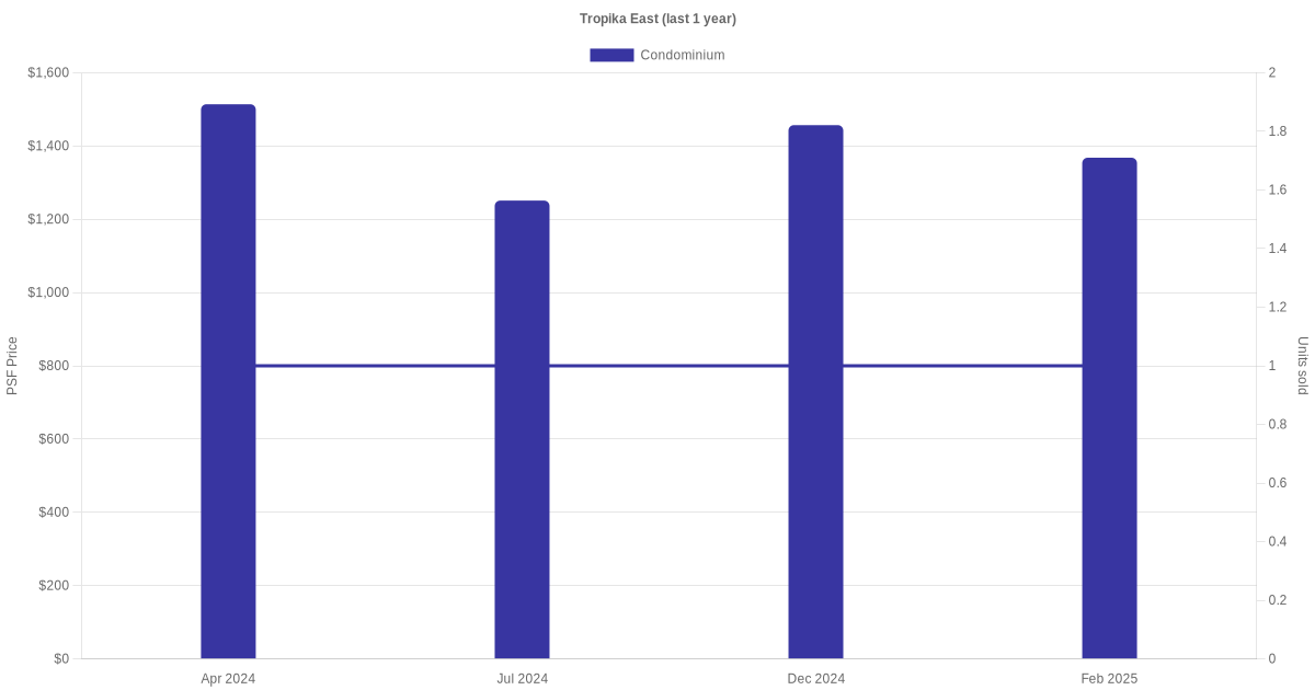 There were a total of 12 sales transactions for Tropika East in the last 3 years, with the latest one recorded in Oct 2025. Disclaimer : our transactions data below does not include block numbers as the data is not available.