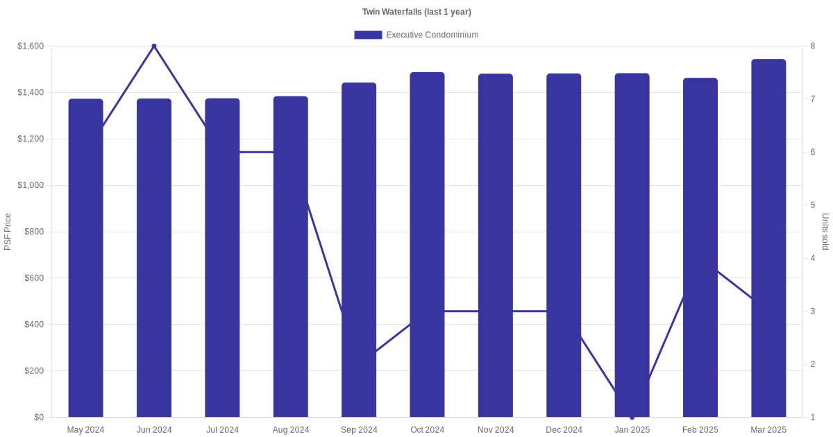 The graph below shows the average monthly transacted sale price for each of the executive condominium units for Twin Waterfalls in the last 3 years. This is based on the transactional data collated for Twin Waterfalls for the selected period.