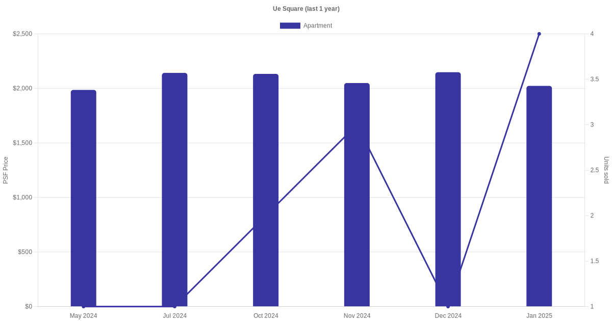 The graph below shows the average monthly transacted sale price for each of the apartment units for Ue Square in the last 3 years. This is based on the transactional data collated for Ue Square for the selected period.