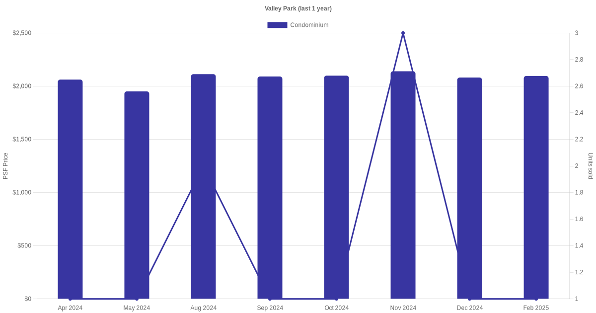 The graph below shows the average monthly transacted sale price for each of the condominium units for Valley Park in the last 3 years. This is based on the transactional data collated for Valley Park for the selected period.