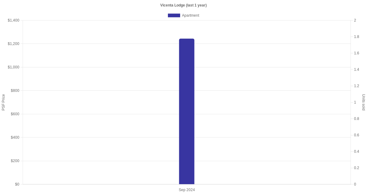 There were a total of 2 sales transactions for Vicenta Lodge in the last 3 years, with the latest one recorded in Sep 2024. Disclaimer : our transactions data below does not include block numbers as the data is not available.