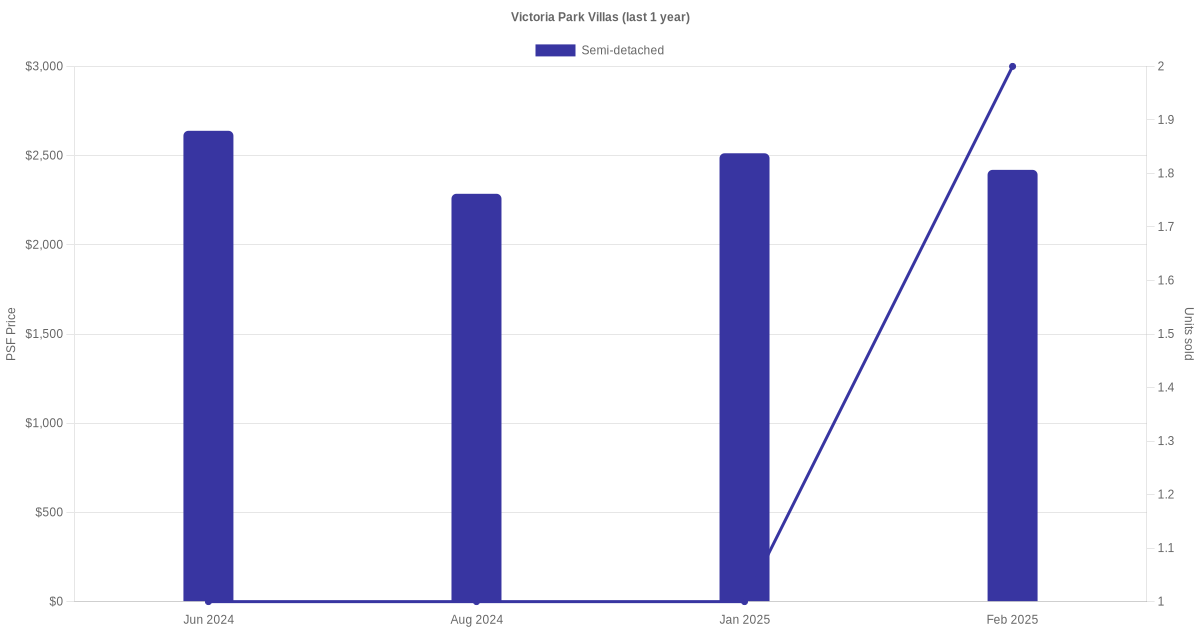 The graph below shows the average monthly transacted sale price for each of the semi-detached units for Victoria Park Villas in the last 3 years. This is based on the transactional data collated for Victoria Park Villas for the selected period.