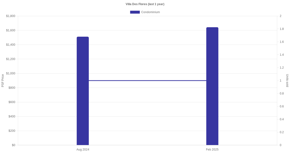 The graph below shows the average monthly transacted sale price for each of the condominium units for Villa Des Flores in the last 3 years. This is based on the transactional data collated for Villa Des Flores for the selected period.