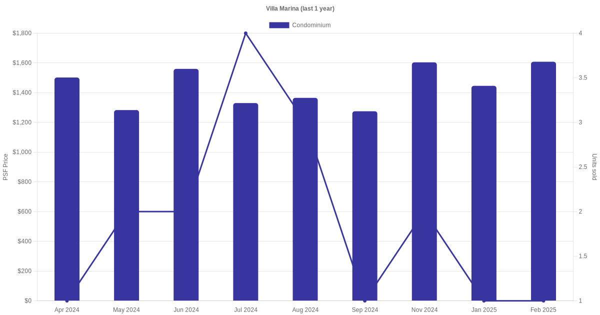 There were a total of 45 sales transactions for Villa Marina in the last 3 years, with the latest one recorded in Nov 2025. Disclaimer : our transactions data below does not include block numbers as the data is not available. If you would like to see a list of blocks / addresses associated with Villa Marina, please click here.