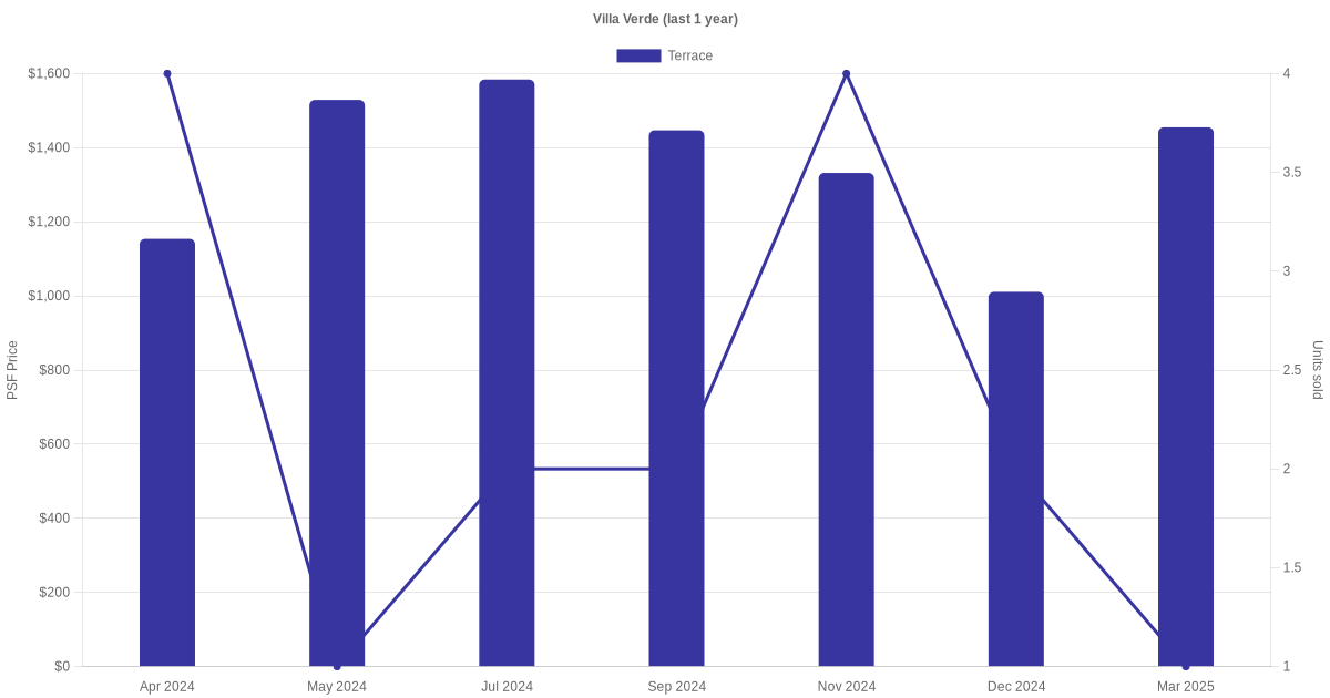 There were a total of 52 sales transactions for Villa Verde in the last 3 years, with the latest one recorded in Dec 2025. Disclaimer : our transactions data below does not include block numbers as the data is not available. If you would like to see a list of blocks / addresses associated with Villa Verde, please click here.