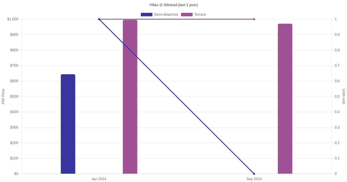 There were a total of 5 sales transactions for Villas @ Gilstead in the last 3 years, with the latest one recorded in Dec 2025. Disclaimer : our transactions data below does not include block numbers as the data is not available.