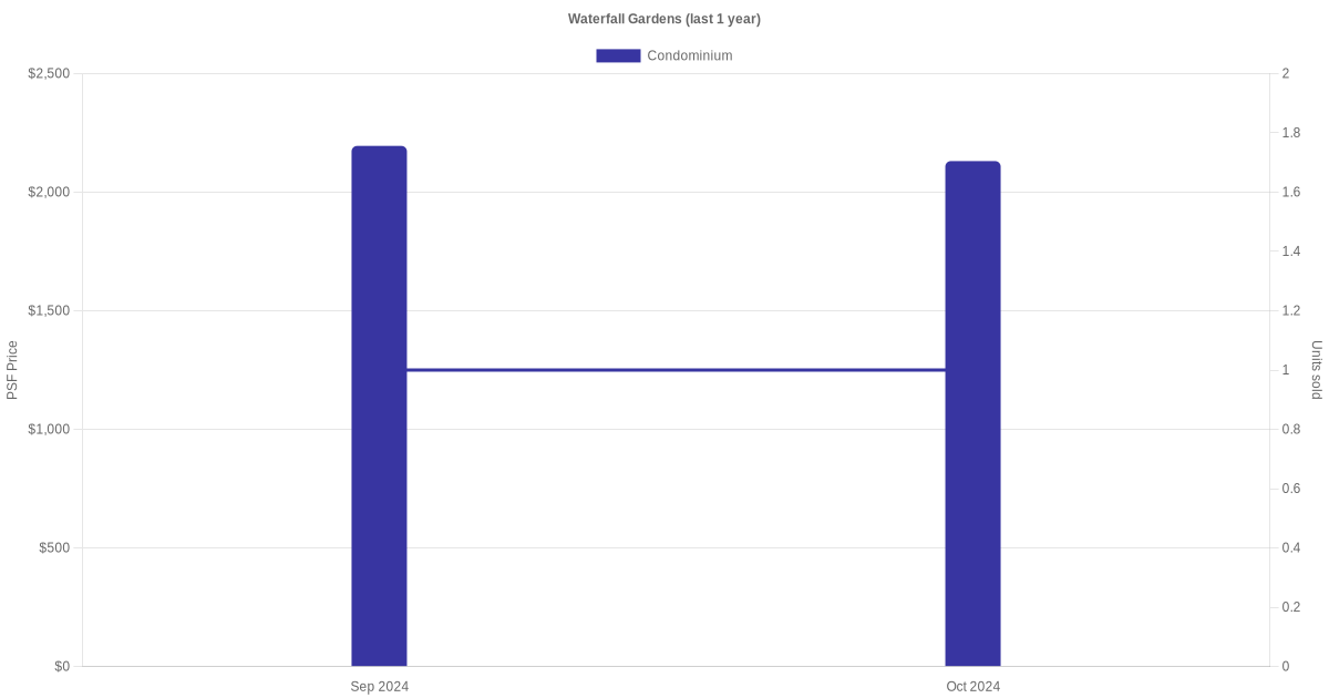 There were a total of 6 sales transactions for Waterfall Gardens in the last 3 years, with the latest one recorded in Jul 2025. Disclaimer : our transactions data below does not include block numbers as the data is not available.