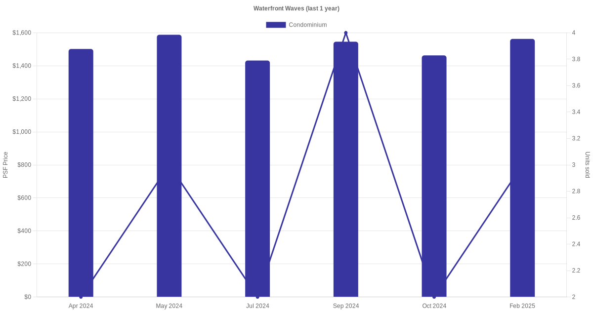 There were a total of 41 sales transactions for Waterfront Waves in the last 3 years, with the latest one recorded in Dec 2025. Disclaimer : our transactions data below does not include block numbers as the data is not available. If you would like to see a list of blocks / addresses associated with Waterfront Waves, please click here.