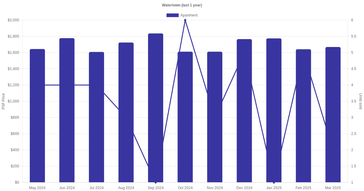The graph below shows the average monthly transacted sale price for each of the apartment units for Watertown in the last 3 years. This is based on the transactional data collated for Watertown for the selected period.
