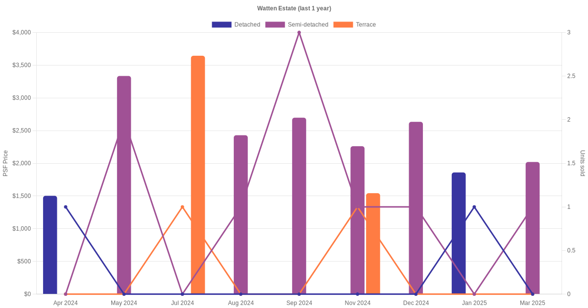 The graph below shows the average monthly transacted sale price for each of the detached, semi-detached and terrace units for Watten Estate in the last 3 years. This is based on the transactional data collated for Watten Estate for the selected period.