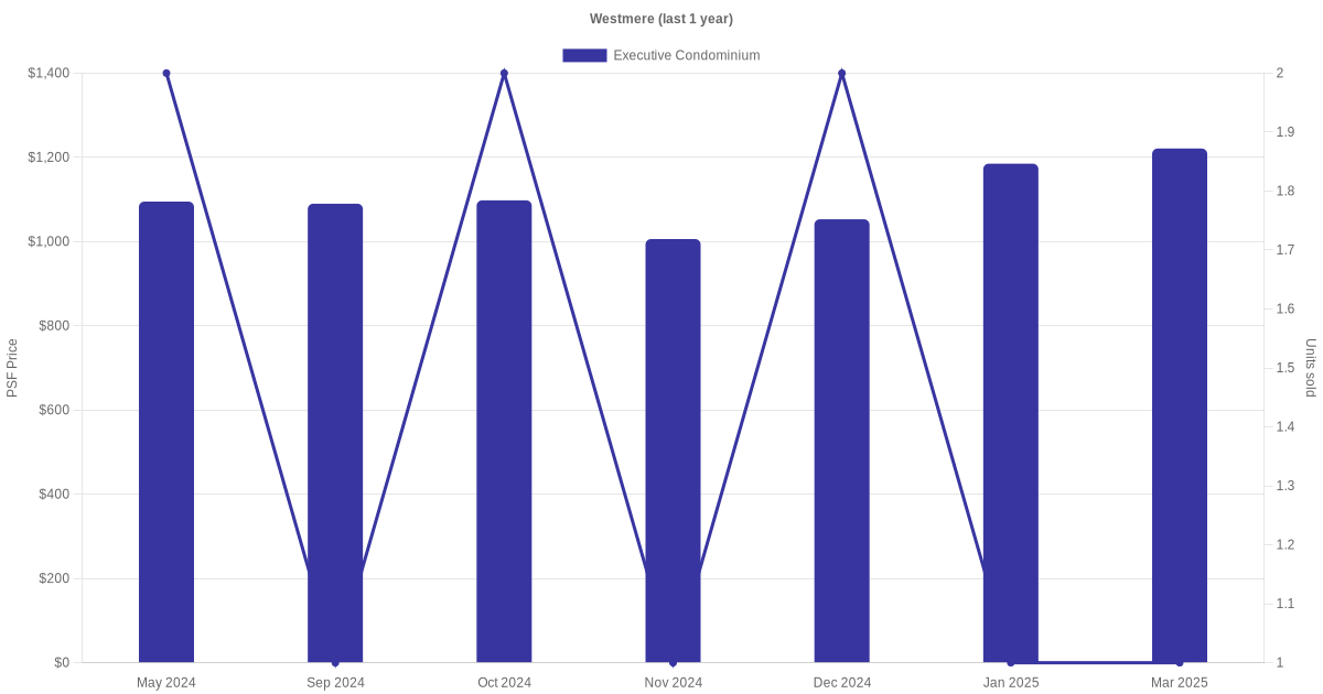 | Mar 2025 | $1,471,688 (Resale) | $1,221 | Executive Condominium | Westmere Jurong East Street 13 (District 22) | 11-15 | 1206 sqft | 99 years | 1996 |