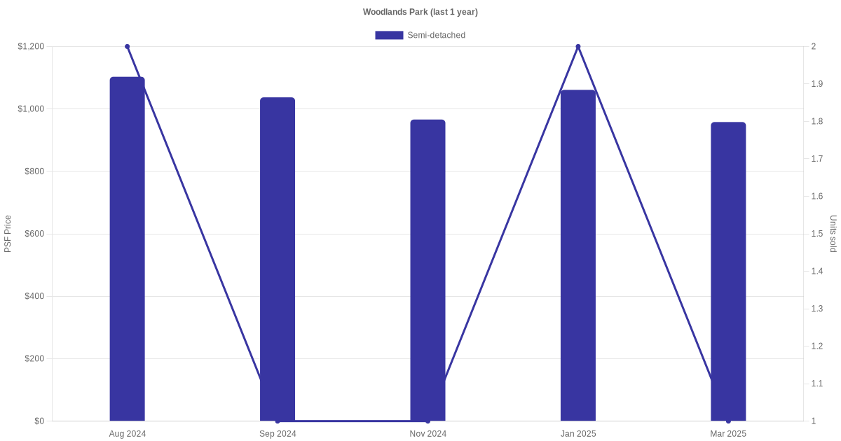 The graph below shows the average monthly transacted sale price for each of the detached and semi-detached units for Woodlands Park in the last 3 years. This is based on the transactional data collated for Woodlands Park for the selected period.